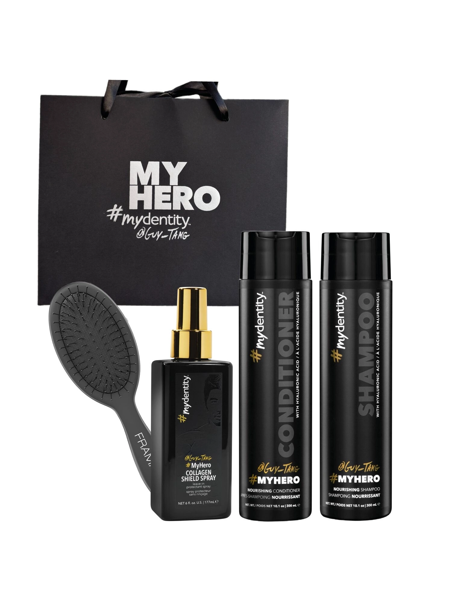 Dárková sada MyHero je ideální volbou pro všechny, kteří chtějí dopřát vlasům výživu, ochranu a snadné rozčesávání v jednom. Obsahuje šampon a kondicionér pro intenzivní hydrataci a regeneraci, ochranný sprej s kolagenem pro posílení a ochranu vlasů před teplem a vnějšími vlivy a praktický mini kartáč Framar pro šetrné rozčesávání bez tahání.