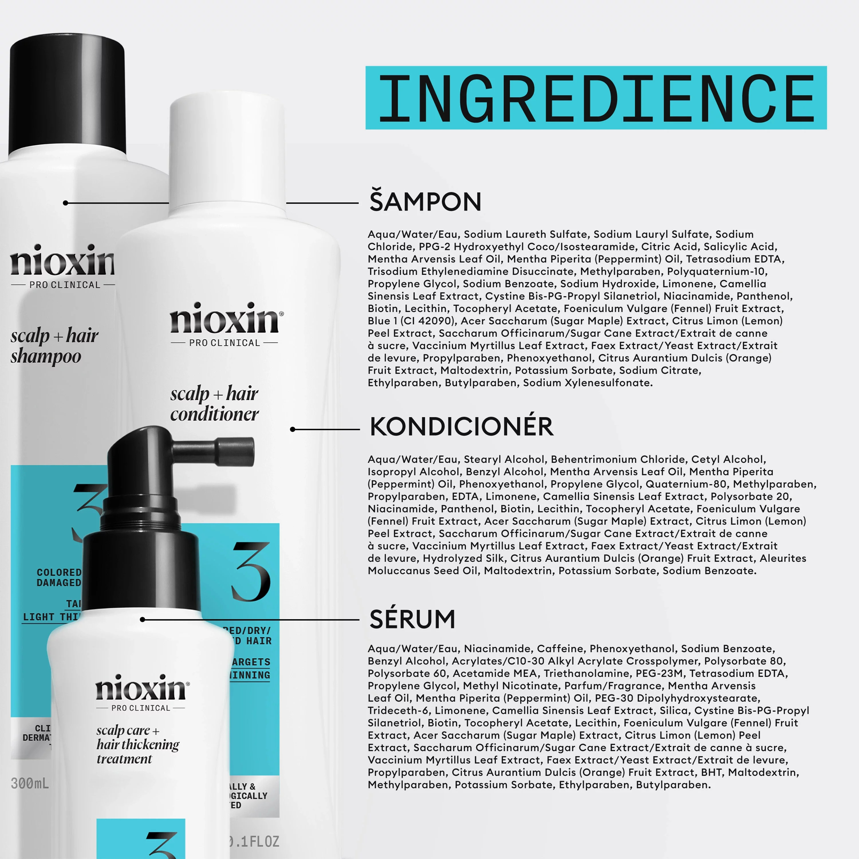 Komplexní rutinní péče zacílená na mírné řídnutí suchých, barvených, chemicky ošetřených jemných vlasů. Sada obsahuje šampon, kondicionér a bezoplachové sérum na vlasovou pokožku. Pro docílení maximálních výsledků je potřeba používat všechny 3 kroky pravidelně a dlouhodobě. Pokud jste v minulosti používali systémovou sadu 5 od Nioxin, tak System 3 ho nahrazuje.
