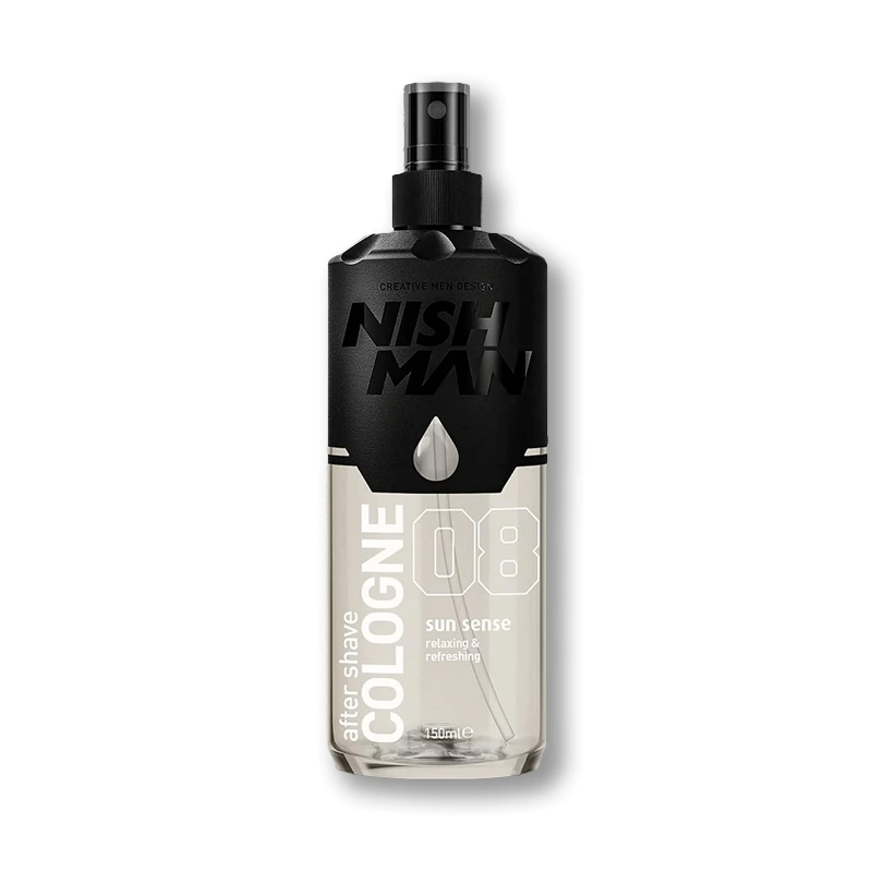 NishMan After Shave Cologne No.8 Sun Sense je voda po holení se svěží letní vůní, která okamžitě osvěžuje, dezinfikuje a zklidňuje pokožku po holení. Zanechává příjemný chladivý pocit, podporuje regeneraci pokožky a dodává dlouhotrvající svěžest. Ideální pro každodenní použití doma i v barbershopech.