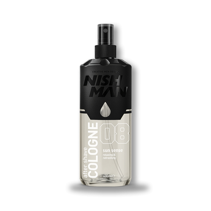 NishMan After Shave Cologne No.8 Sun Sense je voda po holení se svěží letní vůní, která okamžitě osvěžuje, dezinfikuje a zklidňuje pokožku po holení. Zanechává příjemný chladivý pocit, podporuje regeneraci pokožky a dodává dlouhotrvající svěžest. Ideální pro každodenní použití doma i v barbershopech.