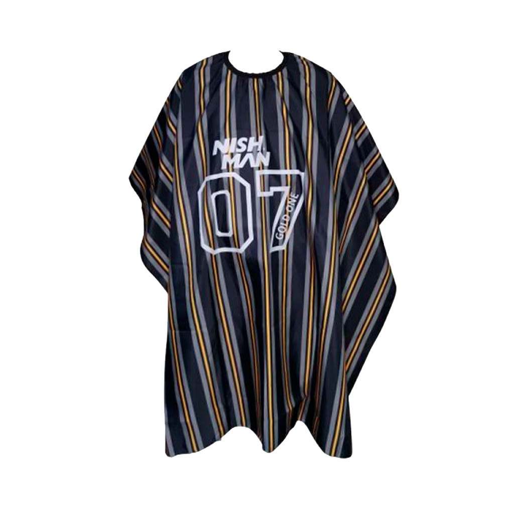 Profesionální barber pláštěnka Nishman Barber Cape 07 Gold One je určena pro každodenní použití v barbershopech i kadeřnictví. Chrání oblečení zákazníka před vlasy, vodou a kosmetickými přípravky během stříhání, holení nebo stylingu. Je vyrobena z lehkého, odolného a voděodpudivého materiálu, který zajišťuje komfort i při delším sezení.