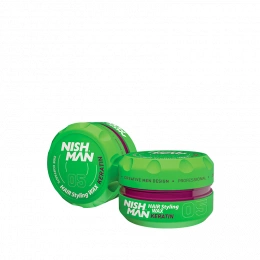 NishMan Hair Styling Wax 05 Keratin je vosk na vlasy s ovocnou vůní bobulí, který poskytuje střední fixaci a střední lesk. Dodává vlasům texturu, objem a pružnost, zatímco obsažený keratin posiluje vlasová vlákna a chrání je před lámáním. Ideální pro každodenní styling s přirozeným efektem a dlouhotrvajícím držením.