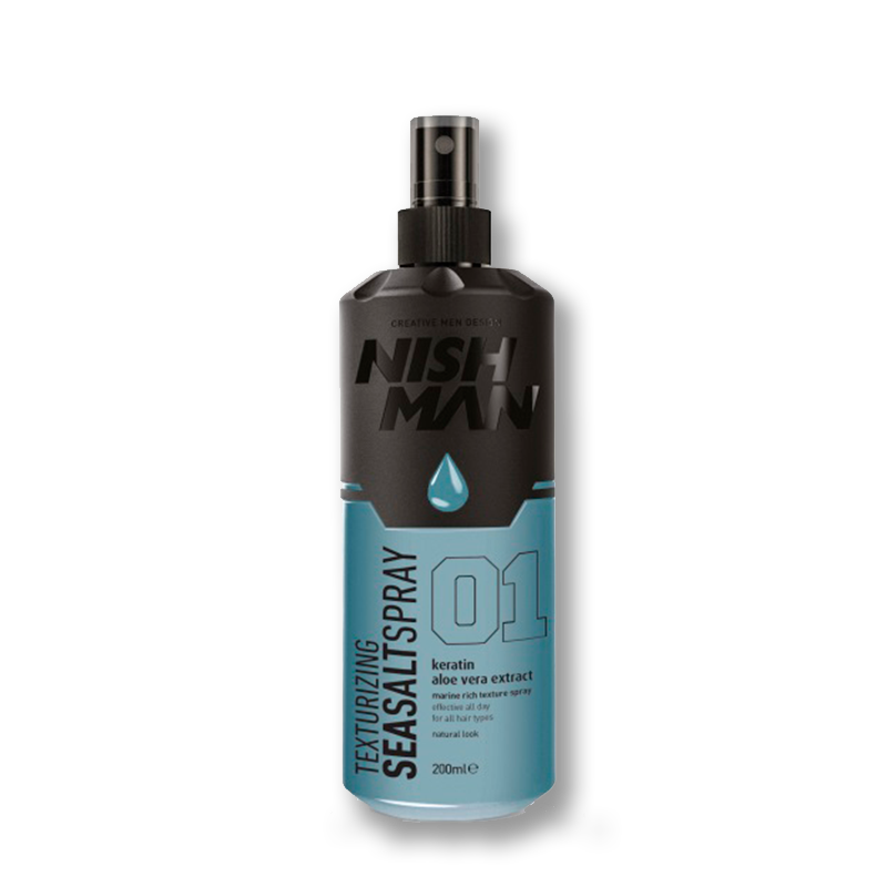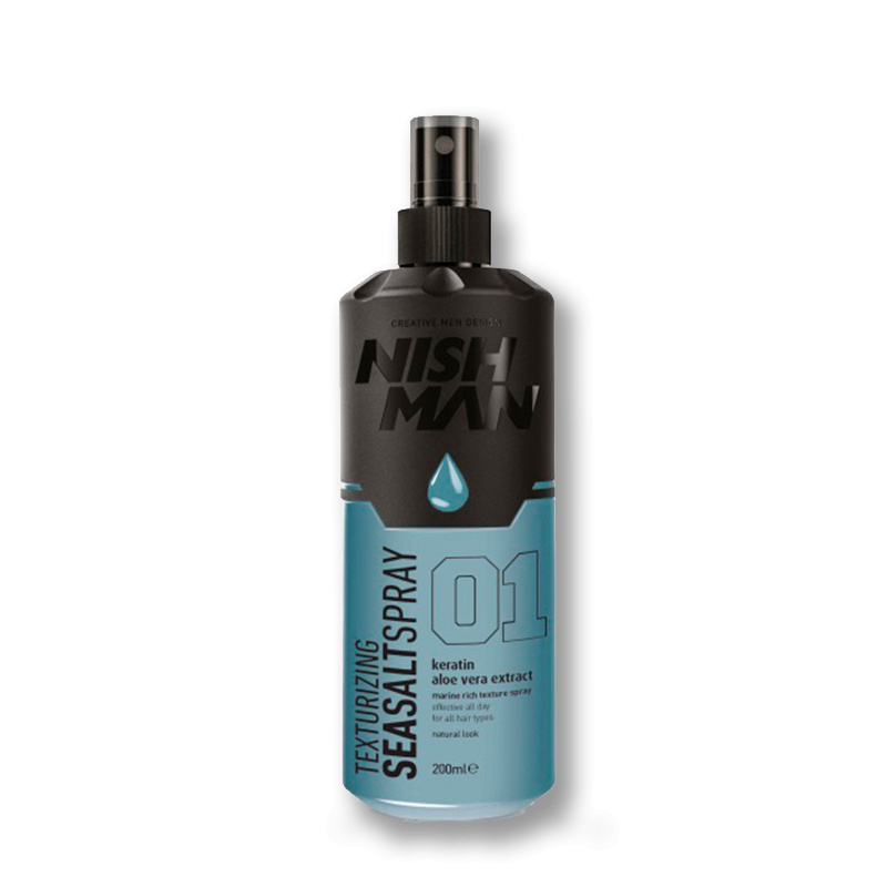 Solný matný sprej na vlasy Nishman Seasalt Spray s keratinem a výtažkem z aloe vera dodává vlasům objem, texturu a přirozený matný vzhled. Zpevňuje vlasové vlákno, podporuje tvar účesu a zanechává vlasy pružné, svěží a snadno upravitelné. Je ideální pro vytvoření ležérních, plážových účesů bez zatížení vlasů.