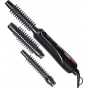 Kulmofén BaByliss Pro Trio má 3 výměnné nástavce - 14 mm, 19 mm a 24 mm. Má zabudovaný termostat, který zaručuje konstantní teplotu. Nepřehřívá se, a tak nedochází k poškození vlasů. Tlačítko nad hlavním vypínačem umožňuje automaticky uvolnit pramen vlasů z kartáče.