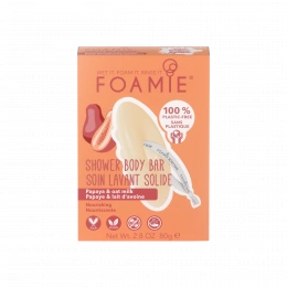 Tuhá sprchová péče Foamie Ovesné mléko a papája Unikátní syndet pro hebkou a čistou pokožku. Sprchová péče 2v1 čistí a zároveň hydratuje pokožku. Přirozené pH pokožku nedráždí. Neobsahuje plasty, sulfáty ani parabeny. Příjemná vůně papáje má uspokojující účinky. Použití: 1. Namočte pod tekoucí vodou. 2. Promasírujte v dlaních pro vytvoření pěny. 3. Masírujte pokožku a užijte si sprchování! 4. Důkladně opláchněte. Po použití zavěste na šňůrku a nechte vyschnout.