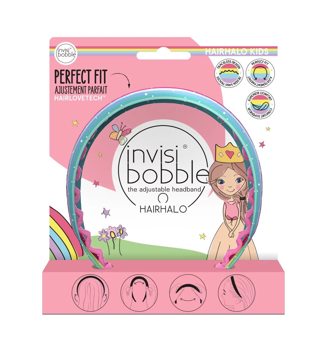Invisibobble KIDS HAIRHALO Rainbow Crown invisibobble HAIRHALO, nastavitelná čelenka. S HAIRLOVETECH™, nezanechává stopy ve vlasech. Nastavitelná velikost a speciální tvar umožňují přizpůsobit HAIRHALO každému tvaru hlavy. To znamená, že se vyhnete tlaku a bolesti z celodenního nošení. Naše KIDS verze je vylepšená možností úpravy velikosti a má krásný design duhy a sladkostí. Nejlepší způsob, jak proměnit každý den v den plný zábavy!