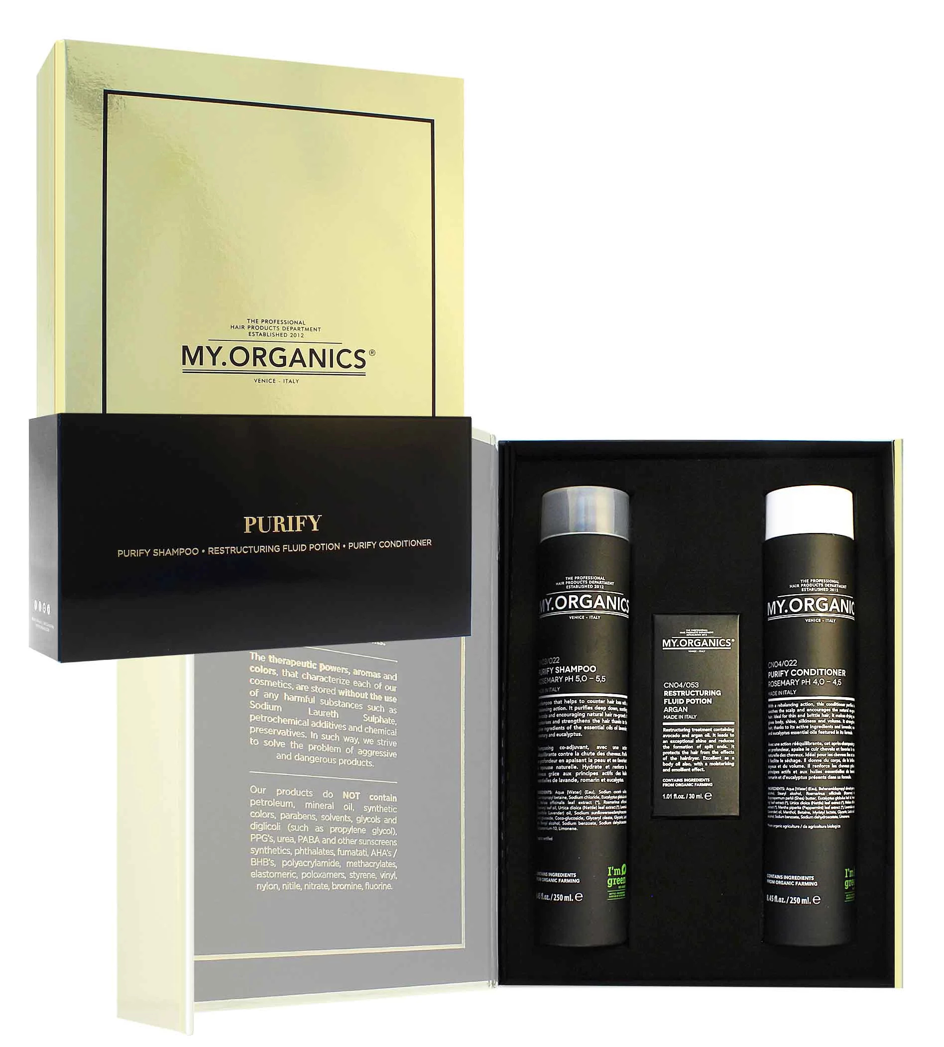Podpůrný šampon pro znovunastolení rovnováhy My.Organics The Organic Purify působí proti padání vlasů. Zajišťuje hloubkovou očistu a současně zklidňuje vlasovou pokožku a podporuje přirozený růst vlasů. Hydratuje a posiluje vlasy díky aktivním složkám obsaženým v esenciálních olejích levandule, rozmarýnu a eukalyptu.