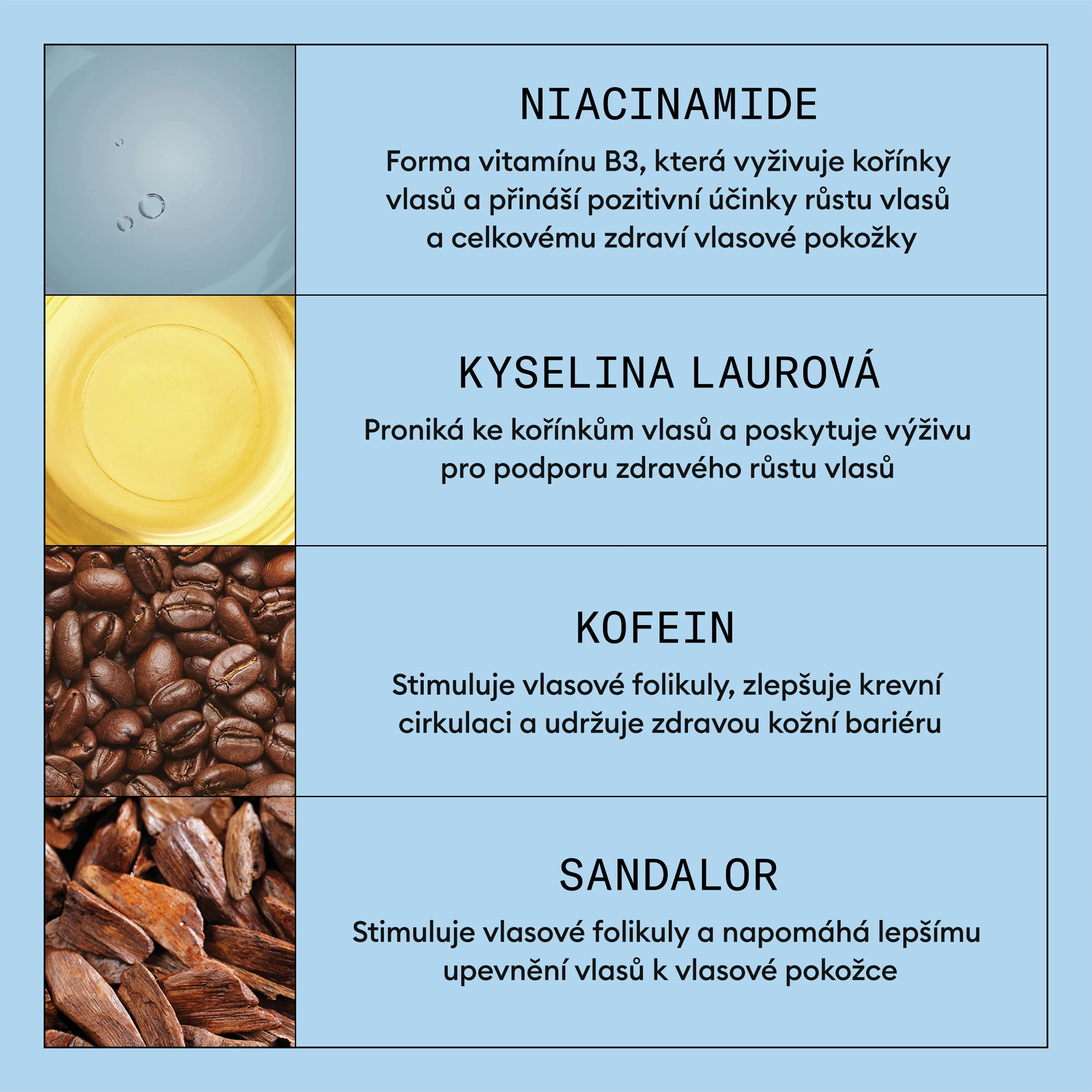 Šampon proti vypadávání vlasů s niacinamidem, biotinem, kofeinem a Sandalore™ odstraňuje usazeniny a zajišťuje* silnější vlasy pro viditelně menší vypadávání vlasů během 12týdnů**. Vhodné pro všechny typy vlasů a úrovně řídnutí.