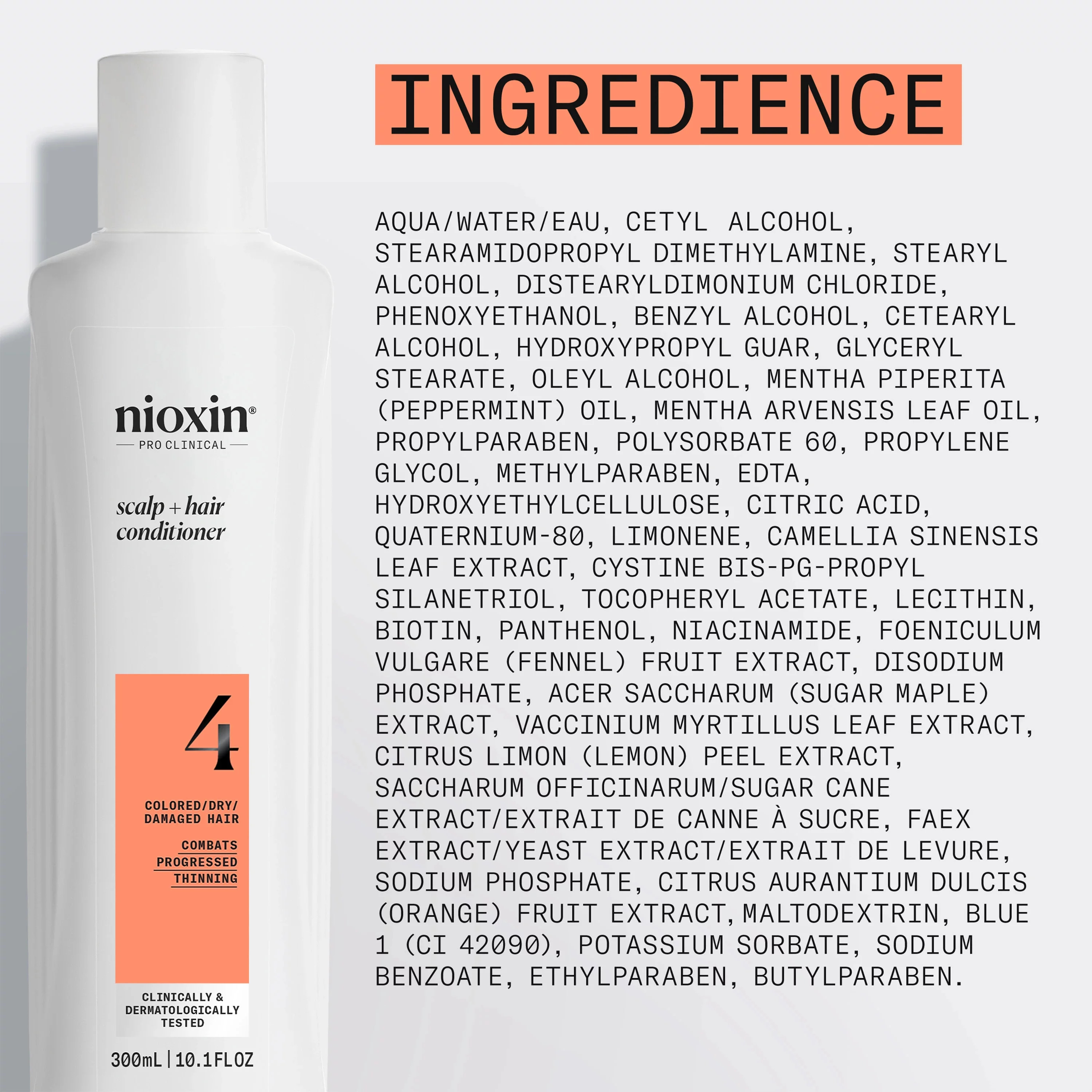 Kondicionér na vlasovou pokožku a suché, barvené a chemicky ošetřené vlasy s pokročilým řídnutím. Lehké složení, díky kterému i jemné slabé vlasy nezplihnou. Součást 3-krokové komplexní péče. Pokud jste v minulosti používali systémovou sadu 6 od Nioxin, tak System 4 ho nahrazuje.