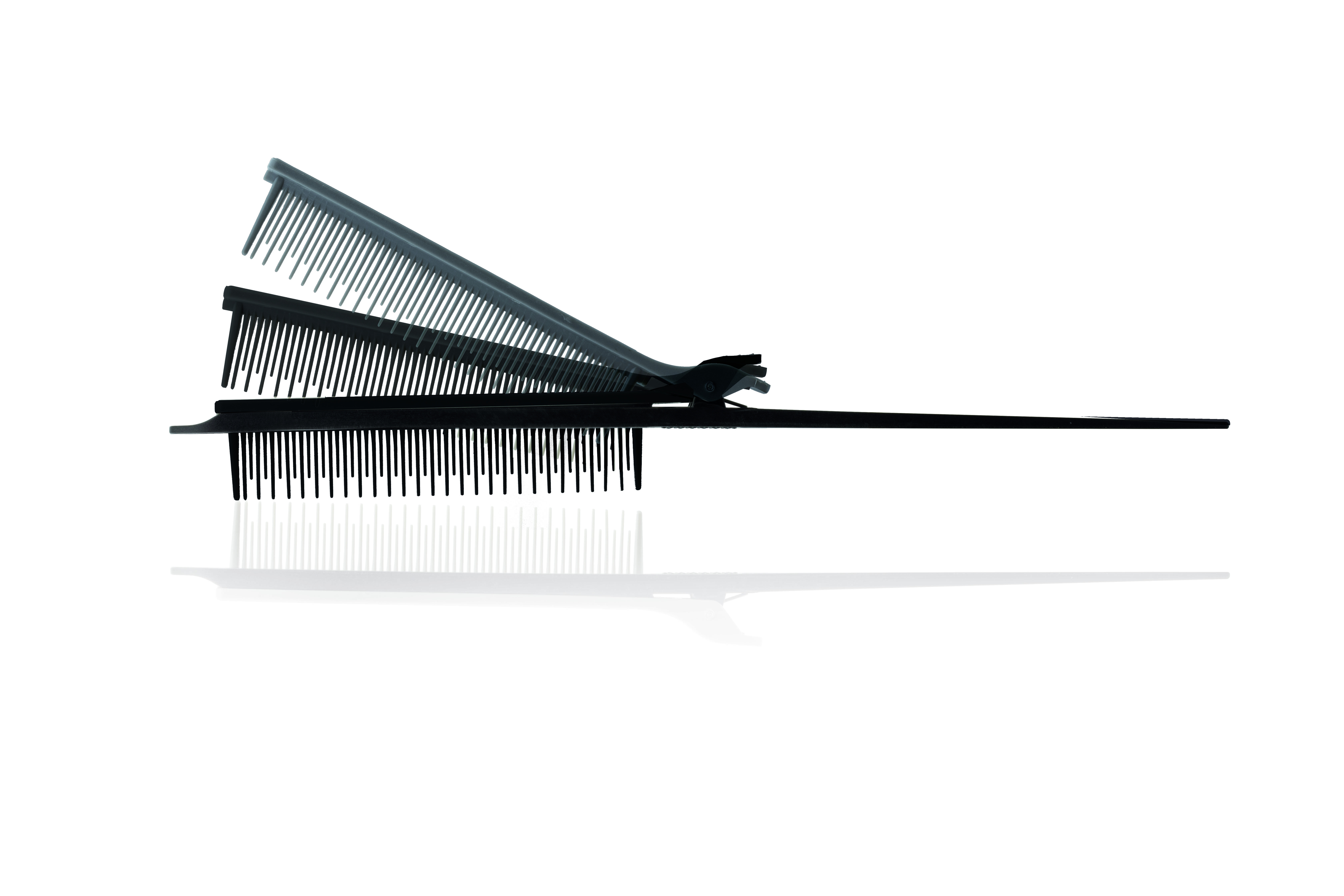 Lehký a pevný karbonový hřeben s praktickou zámkovou sponou pro snadné uchycení vlasů během práce. Vhodný pro profesionální i domácí použití.