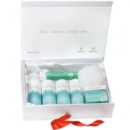 Dárkové balení hydratační péče s kyselinou hyaluronovou zajišťující omlazení a hydrataci pleti a pokožky. Obsahuje nízkomolekulární kyselinu hyaluronovou, která se nazývá molekula mládí, pro svou přirozenou schopnost zachovávat v pleti optimální stupeň hydratace. Kyselina hyaluronová napomáhá udržovat pokožku pevnou, váže na sebe vodu a tím pomáhá vyhlazovat vrásky a drobné linky, urychluje obnovu tkáně, pleť regeneruje a vypíná.