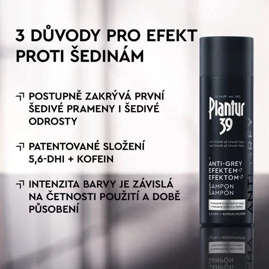 Objevte jednoduché, šetrné a účinné řešení pro šedivé vlasy se šamponem Plantur 39 s anti-grey efektem. Barevný efekt je s každým umytím vlasů viditelnější. Dochází k postupnému a permanentnímu krytí šedin. Výsledkem jsou přirozeně vypadající, trvale tmavší vlasy.