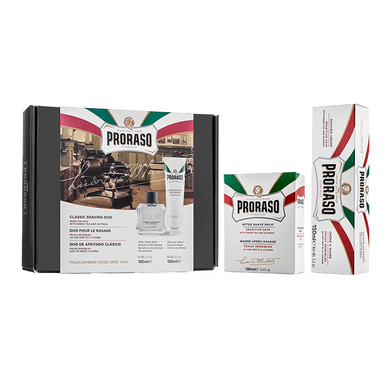 Dárková sada Proraso White je určena pro muže s citlivou pokožkou, která má sklon k podráždění a zarudnutí. Obsahuje krém na holení a balzám po holení z bílé řady Proraso. Krém vytváří jemnou a bohatou pěnu, která zajišťuje hladký skluz strojku a zároveň chrání pleť před podrážděním. Balzám po holení bez alkoholu zklidňuje, hydratuje a podporuje regeneraci pokožky. Jemná kombinace zeleného čaje a ovsa dodává příjemný pocit svěžesti a komfortu.