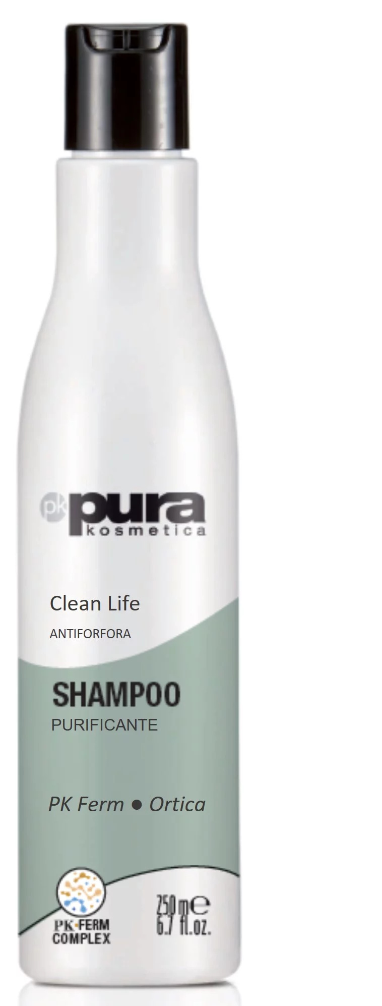 PURA CLEAN LIFE šampon - Čistící proti lupům. jemně myje vlasy, čistí a osvěžuje pokožku hlavy. Složení obohacené o výtažky z kopřivy pomáhá zklidnit pokožku a mírní svědění. Vhodný pro vlasy s mastnými i suchými lupy. Výsledkem jsou čisté vlasy, hydratované, bez nečistot.