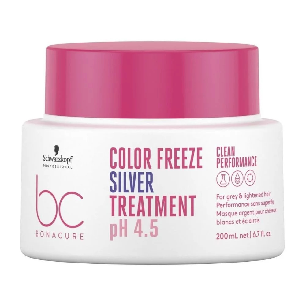 Schwarzkopf BC Bonacure Color Freeze Silver Treatment je pigmentovaná, intenzivně obnovující maska speciálně vytvořená pro šedé a zesvětlené vlasy. Hloubkově vyživuje a neutralizuje nežádoucí teplé podtóny. Neobsahuje silikony a umělé barviva. Vyživující složení s veganským keratinem a technologií Cell Equalizer na jedné straně zajišťuje posílení vlasů zevnitř a na druhé straně uzavírá vrstvu kutikuly, aby zůstaly barevné pigmenty uzamčeny hluboko ve struktuře vlasu. Kúra navrací vlasům jejich optimální hodnotu pH, čímž pomáhá předcházet vyblednutí barvy.