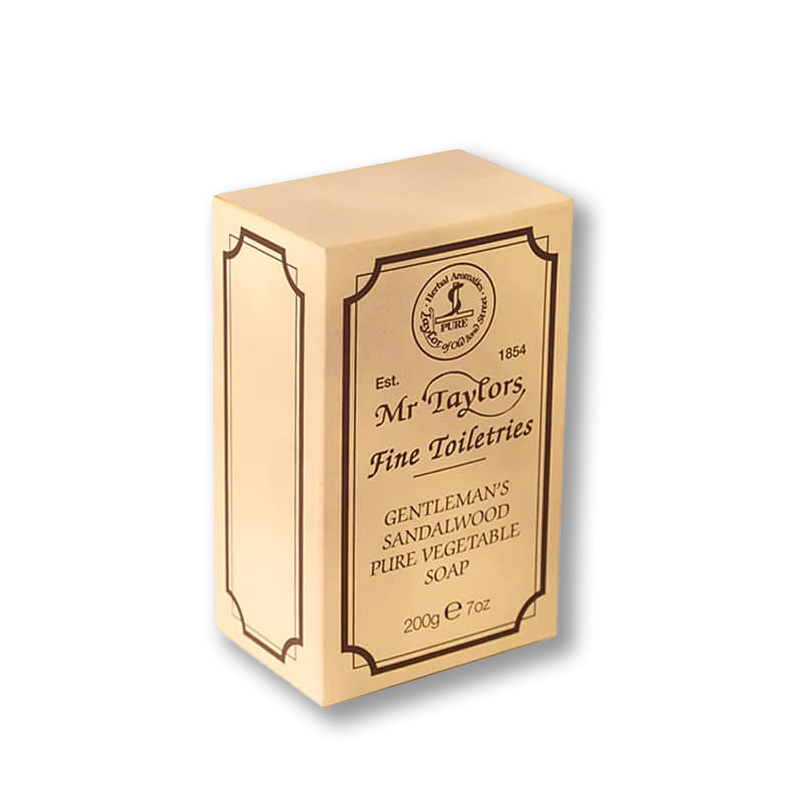 Taylor of Old Bond Street Sandalwood Bath Soap 200 g je luxusní toaletní mýdlo s ikonickou vůní santalového dřeva, které přináší klasický pocit britské elegance. Bohatá krémová pěna šetrně čistí pokožku, zanechává ji hladkou, hebkou a příjemně provoněnou mužnou dřevitou vůní typickou pro kolekci Sandalwood.