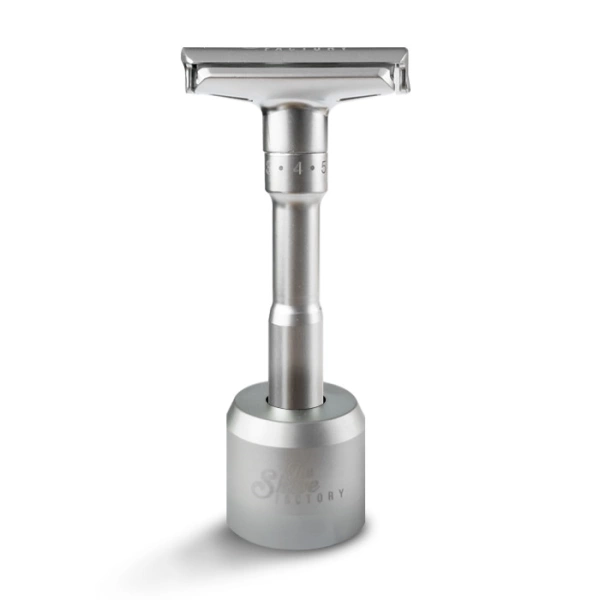 Matný holicí strojek The Shave Factory s nastavitelnou výškou je elegantní a precizně zpracovaný nástroj určený pro profesionální i domácí použití. Moderní design v matném provedení doplňuje praktický stojan a luxusní kufřík pro bezpečné uložení i přenášení.