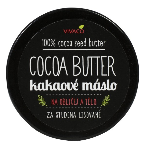 Kakaové máslo vzniklé lisováním pražených kakaových bobů, dokonale pečuje o pokožku a má lehkou konzistenci. Změkčuje, hydratuje a regeneruje pokožku, působí preventivně proti UV záření, zrychluje proces opalování, zlepšuje barvu pokožky. Je doporučováno k ošetření ekzémů, spálenin, odřenin, suché kůže a k potlačení svědění u lupénky. Dokonale se hodí pro péči o vysušené a popraskané rty, dlaně a chodidla. Vhodné pro masáže a v období těhotenství doporučujeme proti striím.