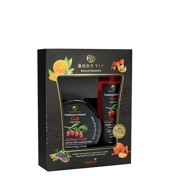 Dárkové balení obsahuje:Zvláčňující krém Goji 200 mlOlejová pěna do koupele Goji 200 ml