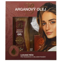 Dárkové balení kosmetiky s bio arganovým olejem v papírové kazetě pro rozmazlující péči o pokožku.