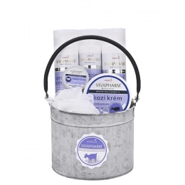 Dárkové balení kosmetiky s kozím mlékem pro péči o pokožku těla i obličeje v dekorativní vaničce.