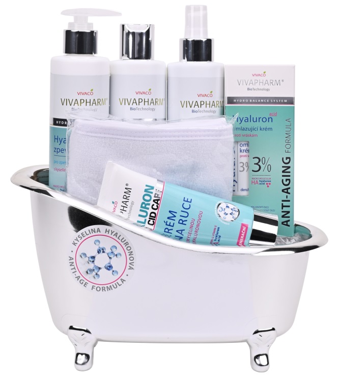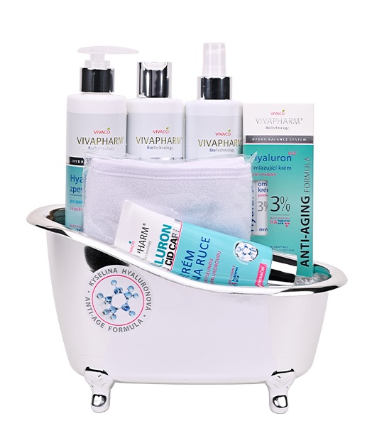 Krásné dárkové balení hydratační péče s kyselinou hyaluronovou v dekorativní vaničce. Darujte krásu a mládí.