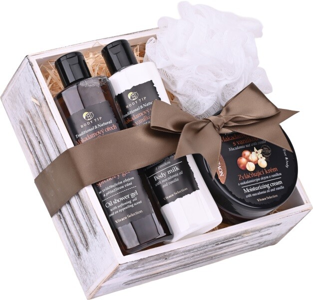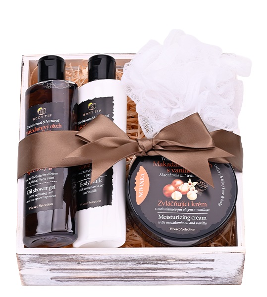Krásné dárkové balení kosmetiky v dekorativní bedýnce s makadamovým olejem a vanilkou.