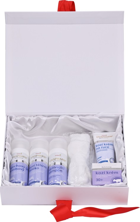 Luxusní balení kosmetiky s kozím mlékem pro péči o pokožku těla i obličeje ve velkém dárkovém boxu.