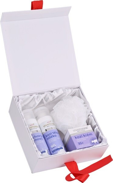 Dárkové balení kosmetiky s kozím mlékem pro péči o pokožku těla i obličeje v dekorativním papírovém boxu.