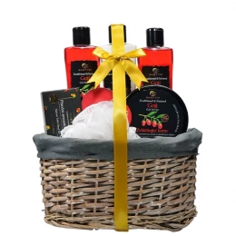 Krásné dárkové balení kosmetiky v dekorativním proutěném koši s výtažky z Kustovnice čínské a mandlovým olejem.