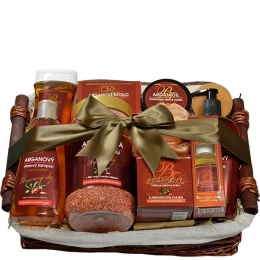 Dárkové balení kosmetiky s bio arganovým olejem pro péči o pokožku těla i obličeje v krásném proutěném koši.