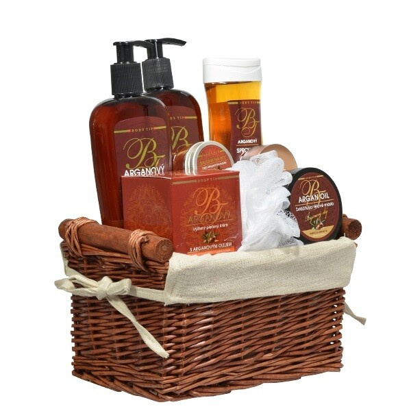 Dárkové balení kosmetiky s bio arganovým olejem pro péči o pokožku těla i obličeje v krásném proutěném koši.