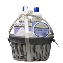 Krásné dárkové balení kosmetiky s kozím mlékem pro péči o pokožku těla i obličeje v proutěném dárkovém koši.