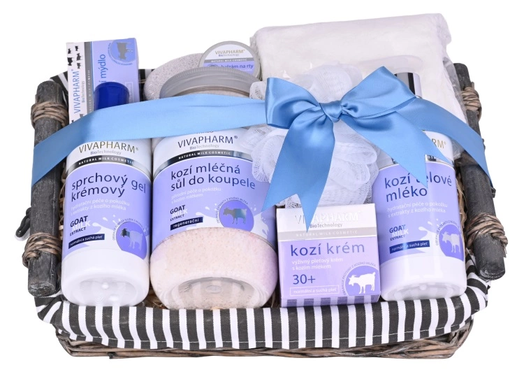 Krásné dárkové balení kosmetiky s kozím mlékem pro péči o pokožku těla i obličeje v proutěném dárkovém koši.