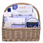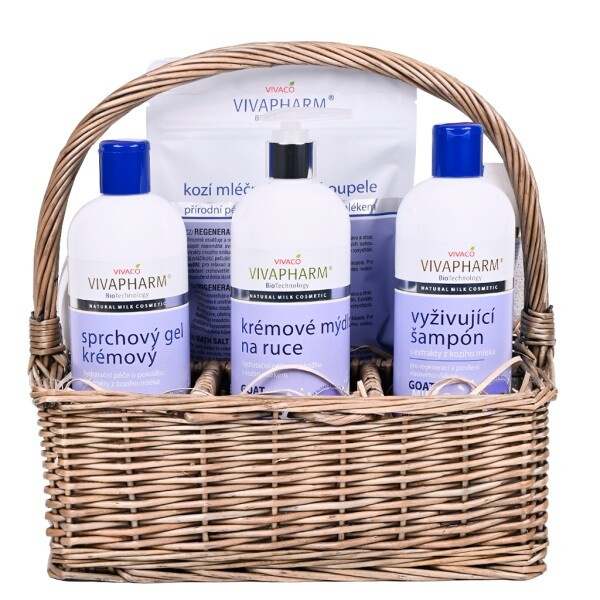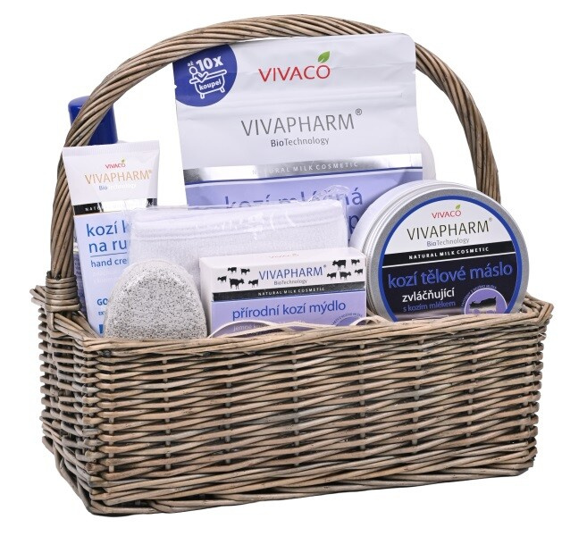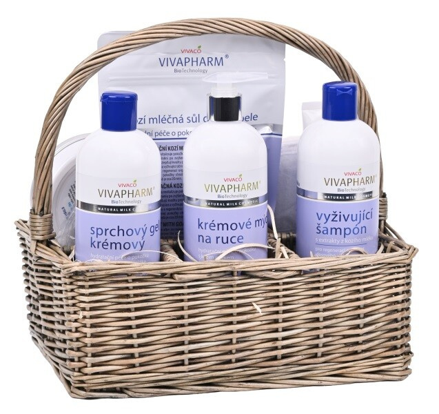 Krásné dárkové balení kosmetiky s kozím mlékem pro péči o pokožku těla i obličeje v proutěném dárkovém koši.