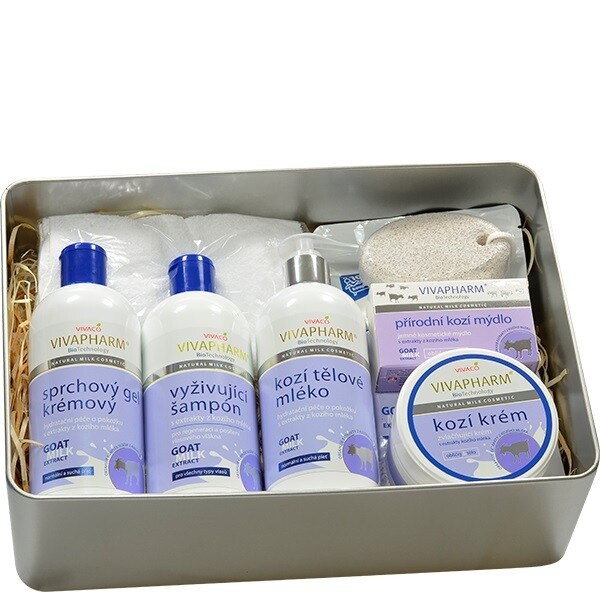 Luxusní balení kosmetiky s kozím mlékem pro péči o pokožku těla i obličeje v plechovém dárkovém boxu.