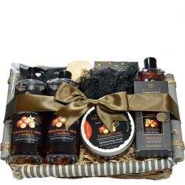 Krásné dárkové balení kosmetiky v dekorativním proutěném koši s makadamovým olejem a vanilkou.