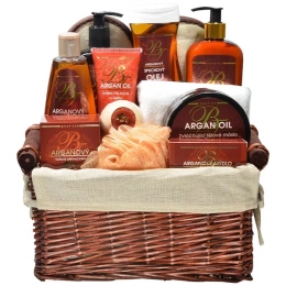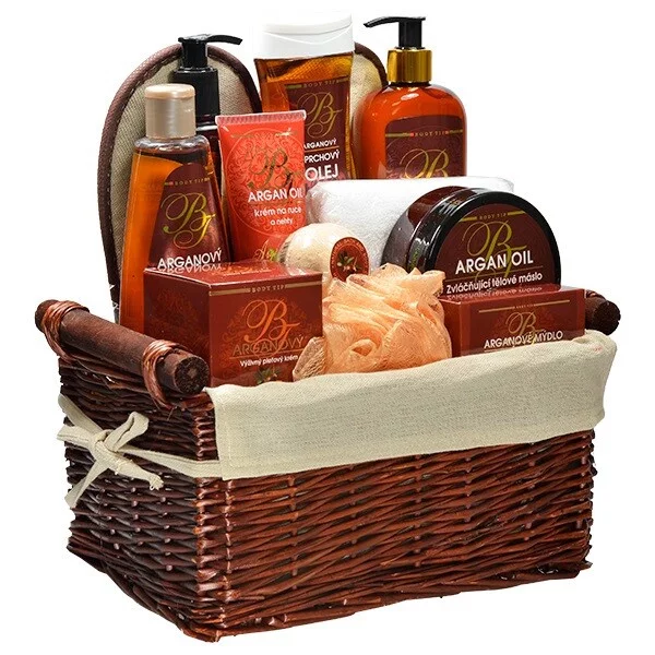 Luxusní dárkové balení kosmetiky s bio arganovým olejem pro péči o pokožku těla i obličeje v krásném dekorativním proutěném koši.