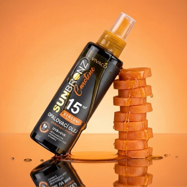 Olej na opalování SPF 15 s karotenem podporující zhnědnutí.