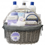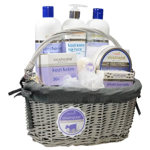 Luxusní balení kosmetiky s kozím mlékem pro péči o pokožku těla i obličeje ve velkém proutěném koši.