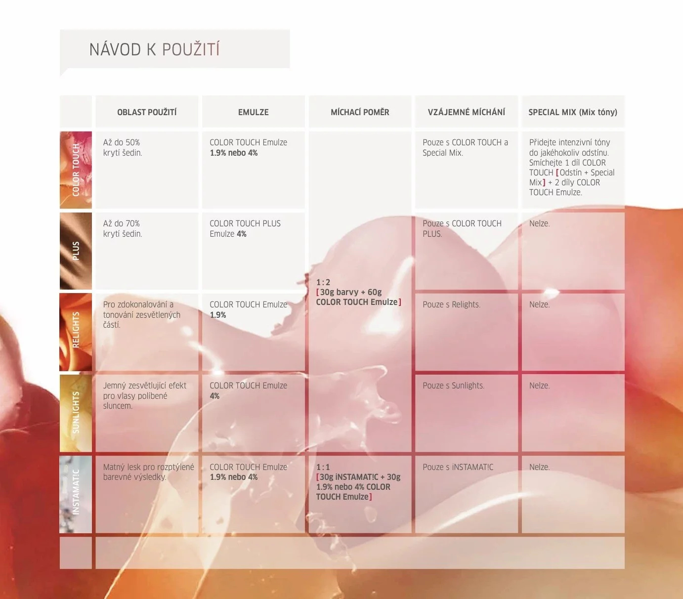 Intenzivní vyvíjecí emulze je určena pro míchání s barvou Color Touch značky Wella Professionals - s barvícími krémy Wella Professionals Color Touch Deep Browns, Pure Naturals, Rich Naturals a Vibrant Reds. Vlasy zůstávají po používání barvy Color Touch zdravé, krásné a zářivě lesklé.