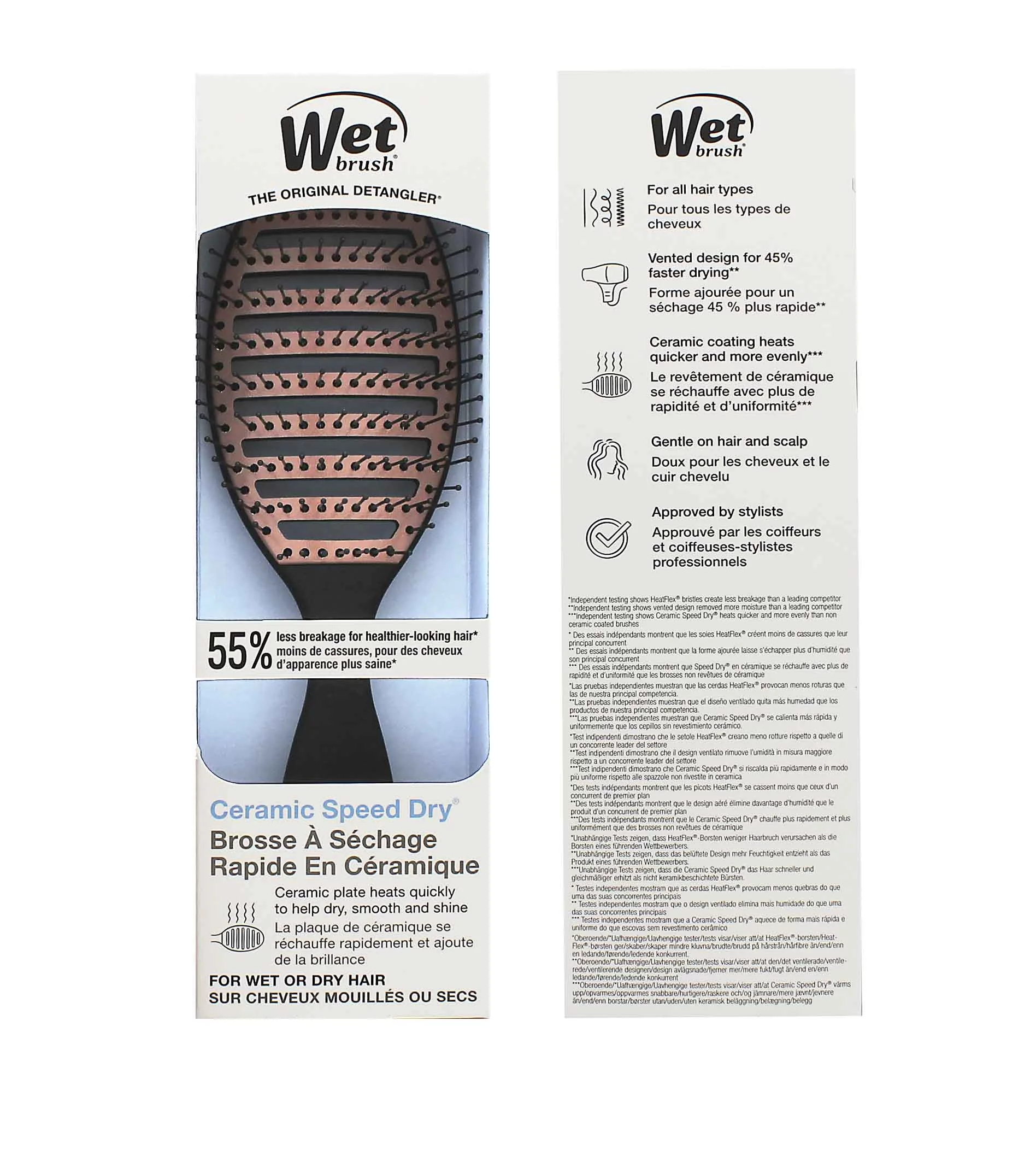 Upgradujte svou stylingovou rutinu a chraňte své vlasy před poškozením s kartáčem Wet Brush® Ceramic Speed Dry®. Jeho odvětrávaný design umožňuje průchod vzduchu kartáčem, čímž se urychluje doba sušení a snižuje se vystavení vlasů teplu. Nový keramický povrch se rychleji zahřívá a pomáhá sušit vlasy o 45 % rychleji. Štětiny HeatFlex® se při úpravě ohýbají, zabraňují tahání nebo zachycování pramenů a chrání tak vlasy před lámáním a poškozením. Až o 55 % méně lámavosti pro zdravější vlasy. Funguje skvěle pro všechny typy vlasů.