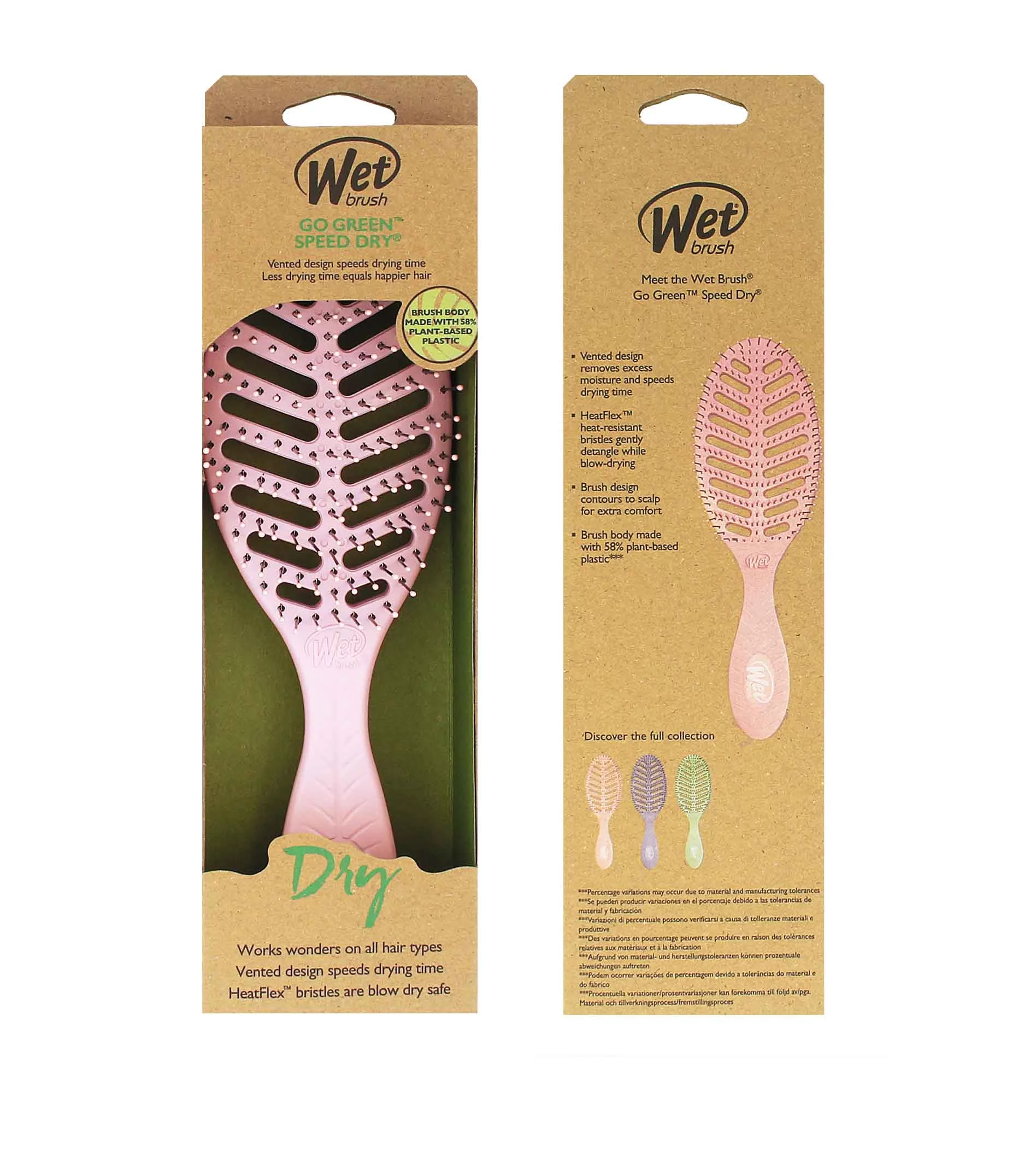 Wet Brush Go Green Speed Dry v růžové barvě přináší ekologické řešení – tělo kartáče je vyrobeno ze 58 % rostlinného plastu – a zároveň nabízí funkční benefity. Otevřený ventilační design umožňuje lepší průtok vzduchu během fénování, což zkracuje dobu sušení a zároveň snižuje dávku tepla působící na vlasy. HeatFlex™ odolné štětiny jemně rozpletou zacuchané prameny i za mokra, bez tahání nebo poškození vlasů.