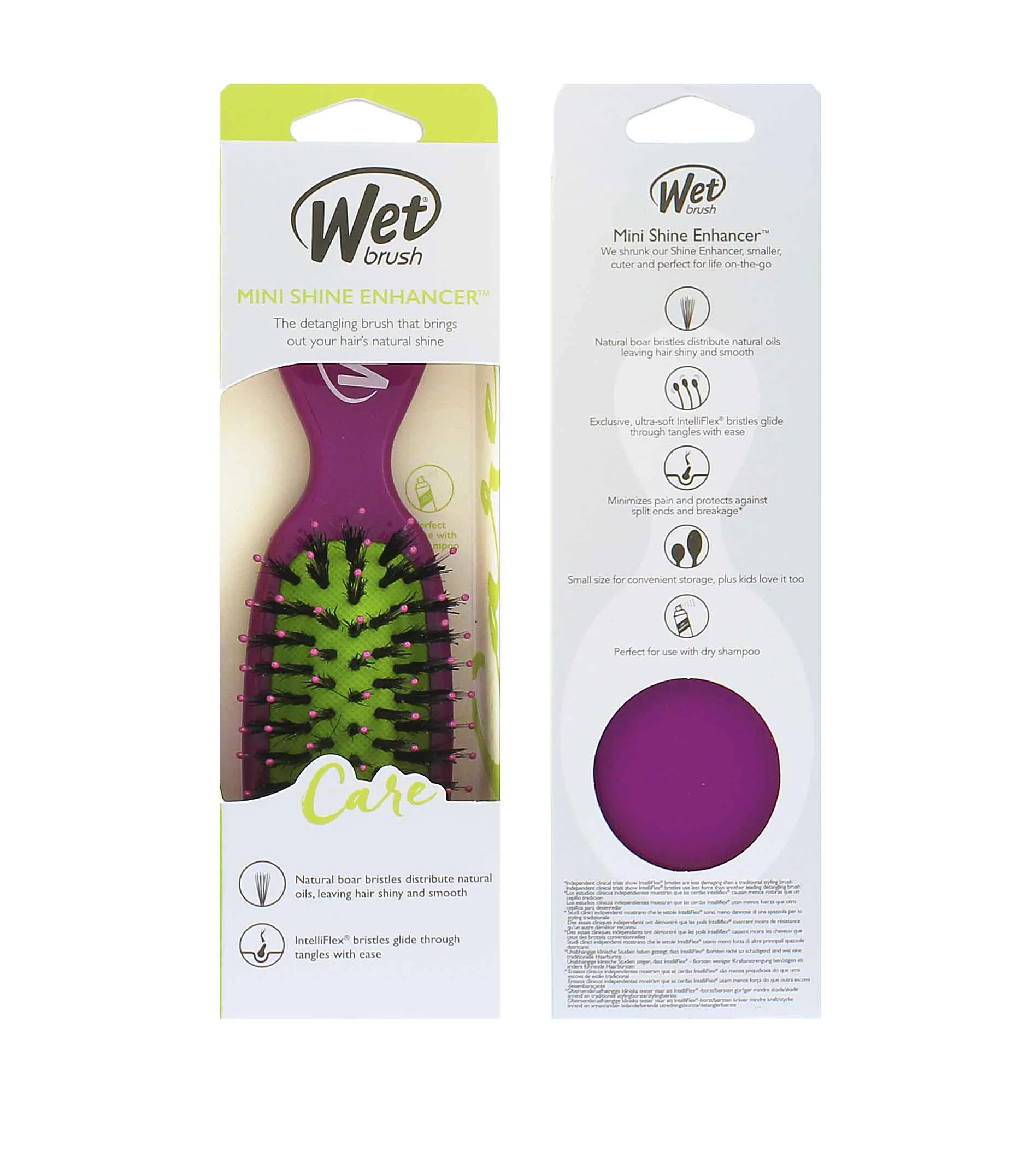 Vlastnosti: kompaktní velikost pro úpravu vlasů na cestách exkluzivní ultra-měkké štětiny IntelliFlex snadno proklouznou zamotáním přírodní kančí štětiny přirozeně odstraňují nečistoty, snižují krepatění a distribuují přírodní oleje vlasů pro lesklý a hladký povrch minimalizuje bolest, lámání a poškození vlasů chrání před roztřepenými konečky o 45 % menší poškození, o 55 % méně námahy, o 100 % šťastnější vlasy funguje pro všechny typy vlasů k použití na suché vlasy nepoužívejte s fénem