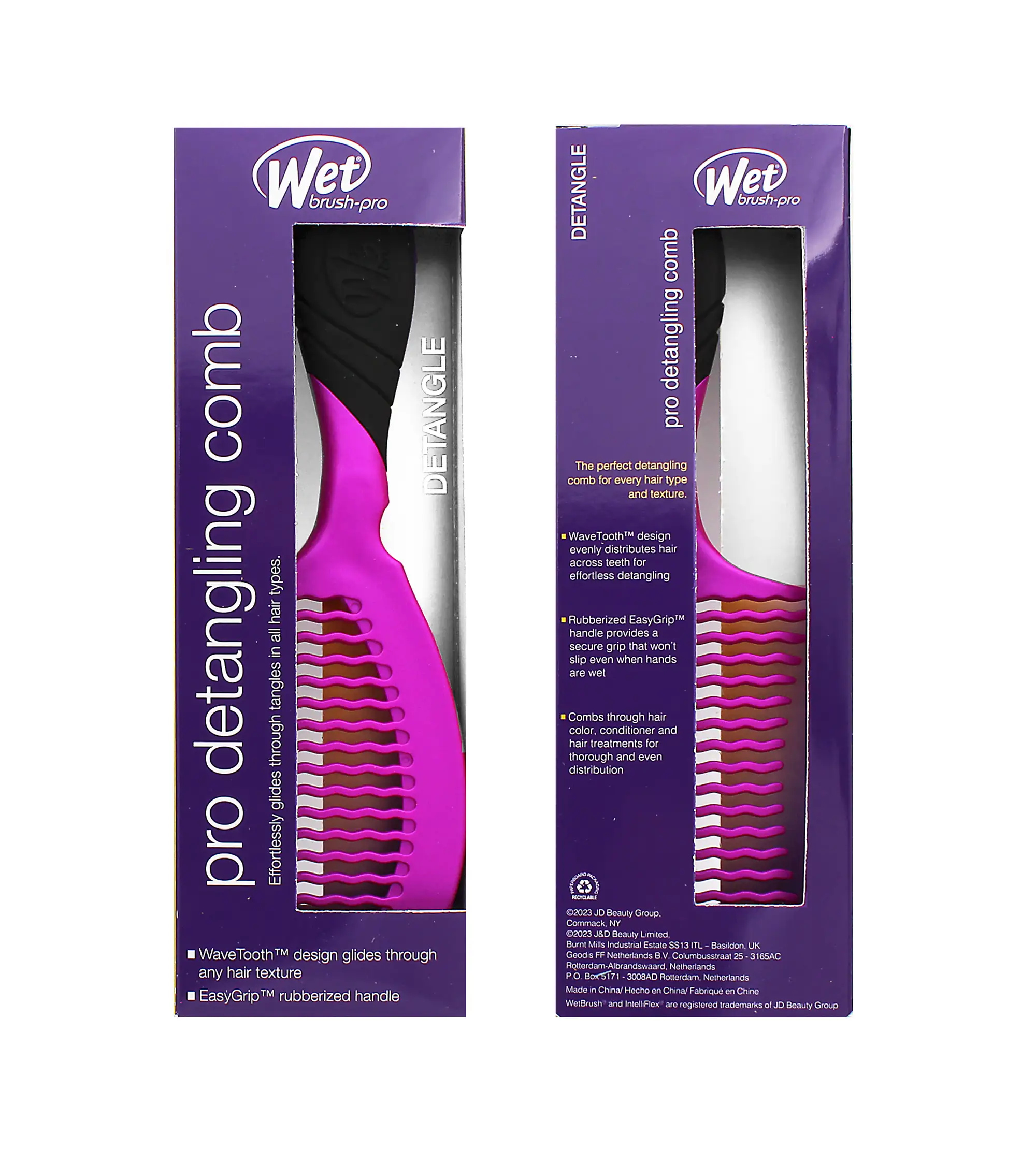 Wet Brush Pro Detangling Comb Purple je profesionální hřeben navržený pro šetrné rozčesávání mokrých i suchých vlasů. Díky flexibilním hrotům IntelliFlex® pomáhá snadno uvolňovat zacuchané prameny bez zbytečného tahání a lámání vlasů. Vlasy tak zůstávají hladké, upravené a méně náchylné k poškození. Ergonomický design navíc zajišťuje pohodlnou manipulaci při každodenním použití.