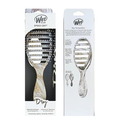 Upgradujte svou stylingovou rutinu a chraňte své vlasy před poškozením s kartáčem Wet Brush® Speed Dry®. Jeho odvětrávaný design umožňuje průchod vzduchu kartáčem, čímž se urychluje doba sušení a snižuje se vystavení vlasů teplu. Štětiny HeatFlex® se při úpravě ohýbají, zabraňují tahání nebo zachycování pramenů a chrání tak vlasy před lámáním a poškozením.