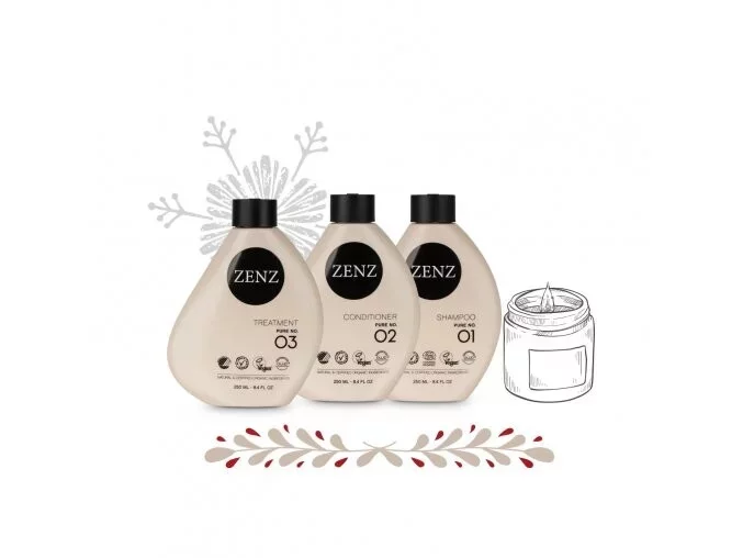Dárkový balíček s vlasovou péčí ZENZ a svíčkou od ENTENTYKY s vůní perníčku nebo pomeranče se skořicí.
